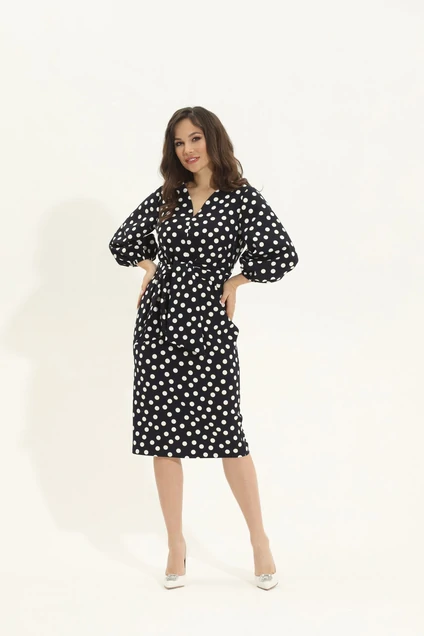Стильное платье выполнено из плательной ткани с принтом в горох. Платье полуприлегающего силуэта, слегка заужено к низу , талия отрезная . Головина V-образная с мягким скруглением. Рукав-буф втачной, ниже локтя, книзу присборен на эластичную тесьму. По спинке средний шов с застежкой на потайную молнию и разрезом к низу. Платье дополнено широким съемным поясом, выполненным из основной ткани. Длина платья от плечевого шва 112см. Длина рукава 49см.
