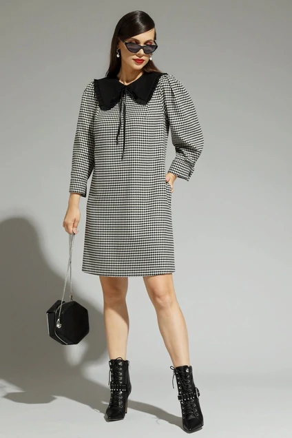 Элегантное маленькое платье А-образного силуэта, без подкладки. Выполнено из костюмно-платьельной ткани. Рукав втачной, дополнен манжетой с застежкой на пришивные пуговицы. Горловина круглой формы, дополнена съемным воротником, фиксирующимся на пришивные кнопки. Платье можно носить как с воротником, так и без него. По спинке платья застежка на потайную молнию. Длина платья от плечевого шва 90см. Длина рукава 53см.