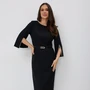 Стильное и утонченное платье прилегающего силуэта из красивой гладкой, слегка мерцающей ткани. Рукав втачной, с разрезами. Горловина округлой формы. По талии платье отрезное. По спинке застежка на потайную молнию, по низу шлица. Платье дополнено по горловине и рукавам декоративной тесьмой с жемчужной нитью. По талии дополнено красивым кожаным поясом с отделкой из жемчуга на пряжке. Длина платья от плечевого шва 126см. Длина рукава 47см.
