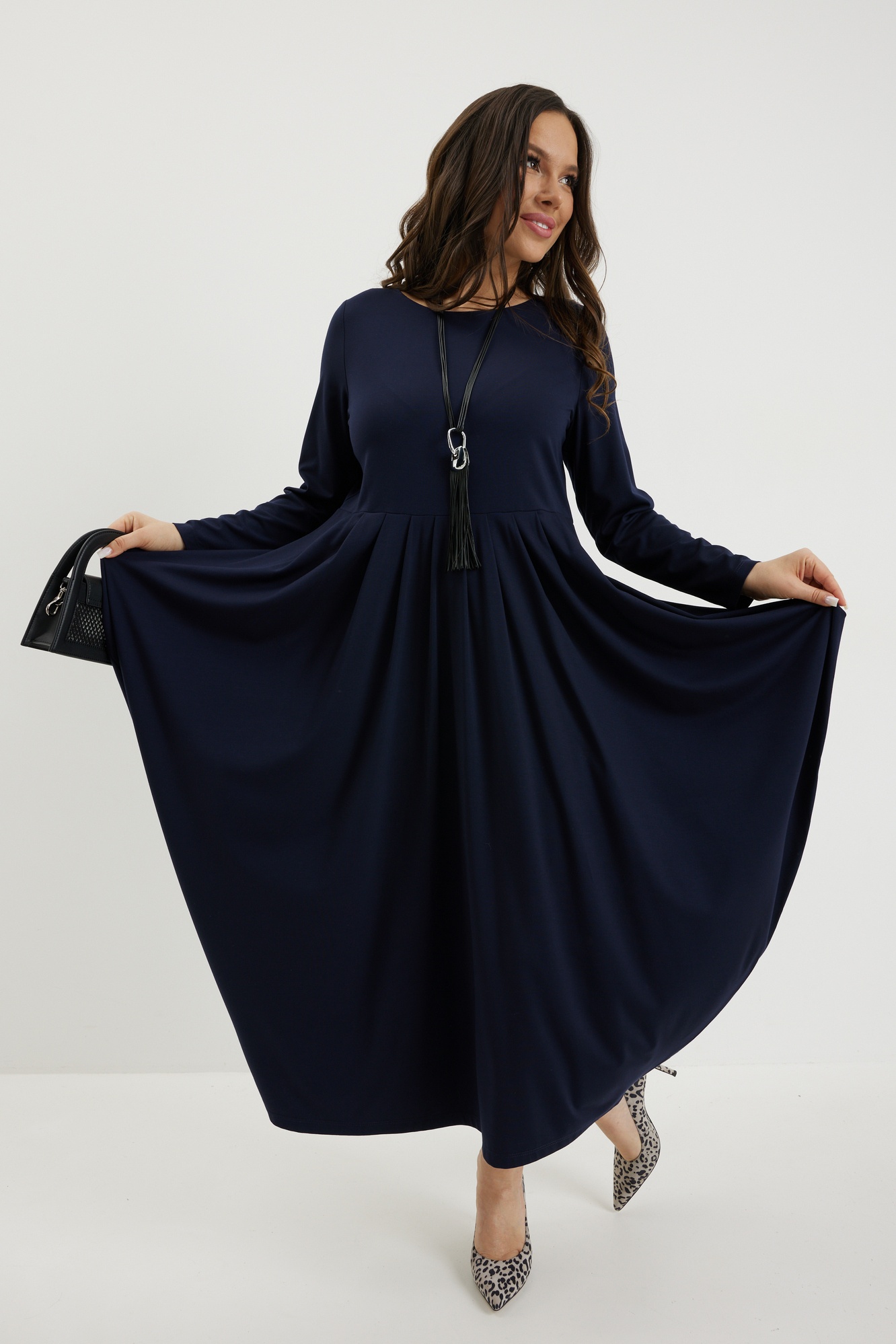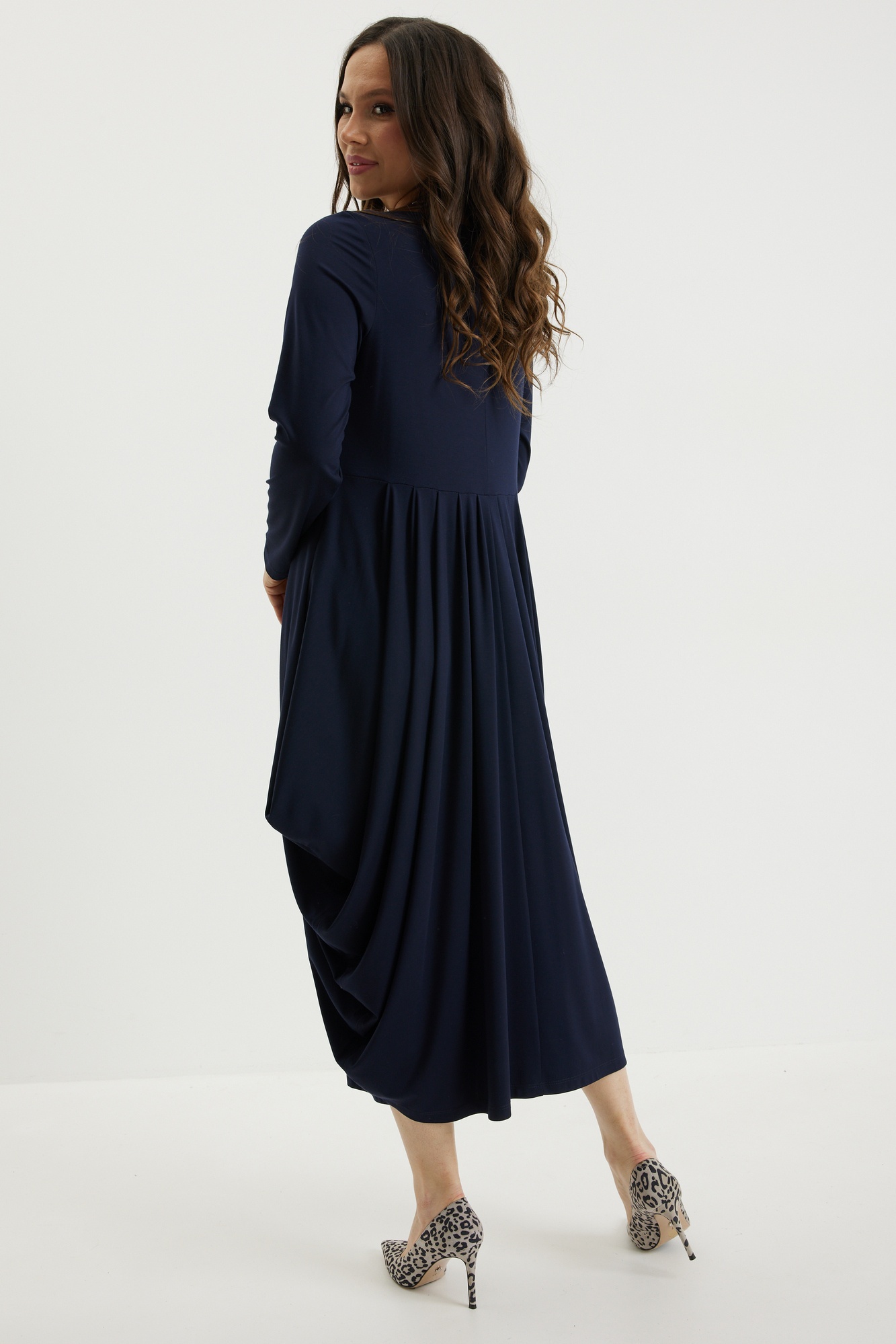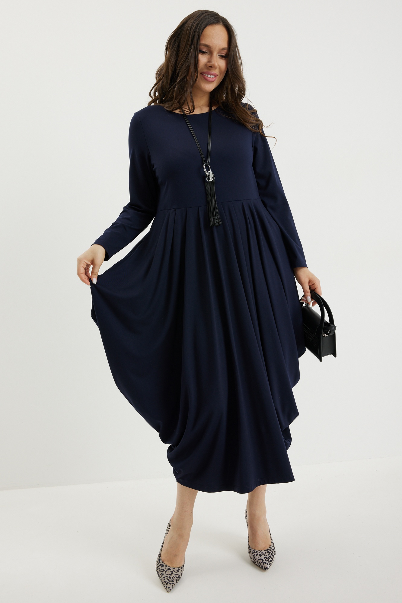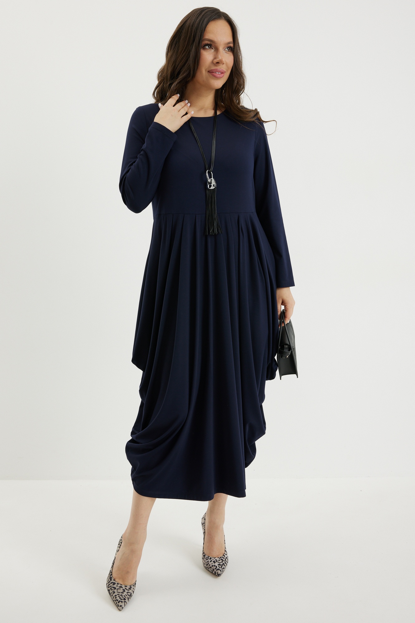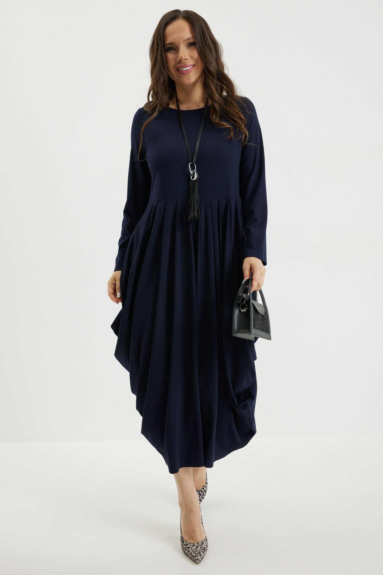 Платье 2697 синий Магия Моды — это стильное решение для вашего гардероба. Коллекция бренда Магия Моды предлагает платье из вискозного трикотажного полотна, которое великолепно струится благодаря складкам на юбке. Фасон платья миди с чуть завышенной талией и оригинальным силуэтом. Длина платья от плечевого шва составляет 120 см, что позволяет носить его в прохладное время года. Глубокий синий цвет добавляет образу утонченную нотку, а длинные рукава делают его удобным для осени и весны. Прекрасно подходит как на каждый день, так и для рабочих встреч. Длина платья от плечевого шва 120см. Длина рукава 59см.