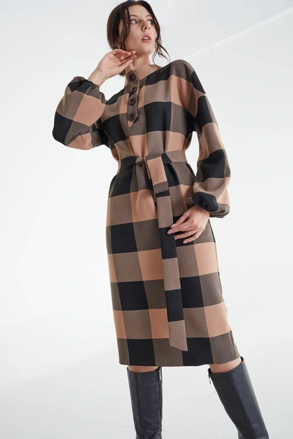 Стильное уютное платье прямого кроя. Вырез горловины - круглый со стойкой. Про центру застежка - пуговицы. Спущенная линия плеча. Рукав втачной, объемный, присборен на эластичную тесьму. По боковому шву - прорезные карманы.В комлекте пояс .