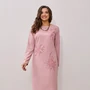 Платье прямого силуэта с крупными декоративными складками по низу юбки. В боковых швах по низу небольшие разрезы. Горловина в форме лодочки, плечо спущенное. Рукав ¾, расширенный книзу, собранный на резинку.