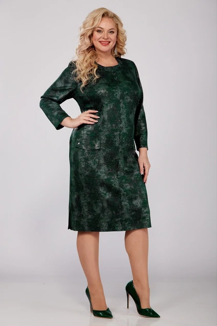 Платье женское полуприлегающего силуэта с втачными одношовными рукавами. Перед с нагрудными вытачками из бокового шва. Горловина округлая, с притачной обтачкой. Перед украшают декоративные настрочные клапаны, узкая настрочная пата с пуговицами у горловины, и узкая застроченная складка по середине. Спинка цельная. По низу боковых швов обработаны разрезы.