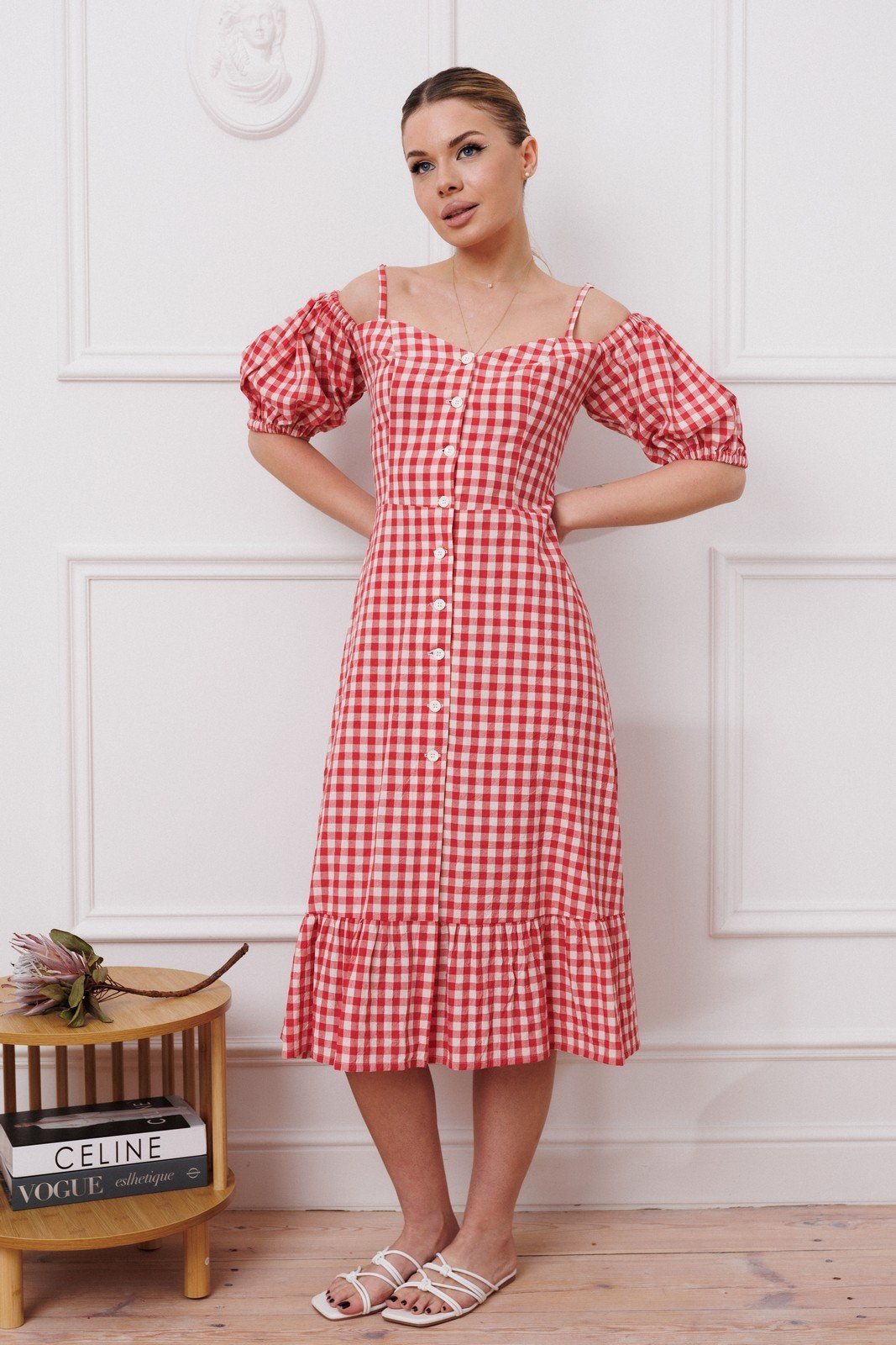 Летнее платье-сарафан с объемными рукавами. Эффектное летнее платье-сарафан с объемными рукавами и летящей юбкой. Бретели обеспечивают комфортную посадку, а сборка на спинке с ниткой-резинкой гарантирует плотное прилегание лифа. Платье отрезное по талии, с юбкой, оформленной оборкой (волан со сборкой) по низу. Сборка под резинку на верхнем и нижнем крае рукавов. Длина миди, без подкладки, с застежкой на петли и пуговицы.Длина юбки - 72-74 см. Длина по боковому шву - 90-91см