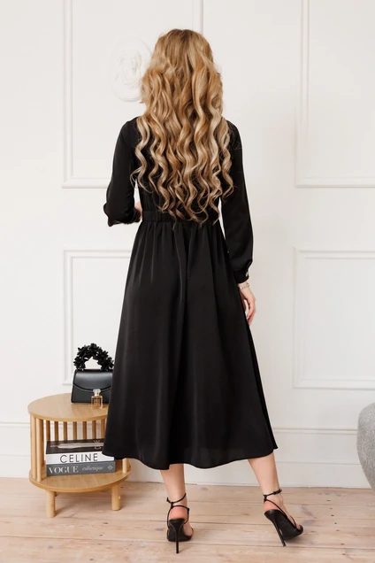 Платье приталенного силуэта, расширенного к низу, отрезное по линии талии, длимной выше шиколодки, без подкладки. Верхняя часть переда с нагрудной вытачкой из бокового шва, со смещенной бортовой застежкой, на два ряда пуговиц. Верхняя и нижняя часть соединены между собой притачным поясом. Пояс по спинке на резинке. в левом боковом шве - застежка на потайную тесьму-молнию.