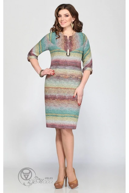 Украшение Платье женское, полуприлегающего силуэта. Спинкасо средним швом,полочка на кокетке. Горловина круглая,на обтачке,по горловине переда обработан разрез с люверсами,в которые продета декоративная подвеска. Рукав двухшовный, 3/4 с не большим отворотом.Низ платья обработан на плоскошовной машине. Длина платья по спинке 100см, длина рукава 35см, ширина рукава на уровне глубины проймы 54-38см, 56-40см, 58-58-42см.