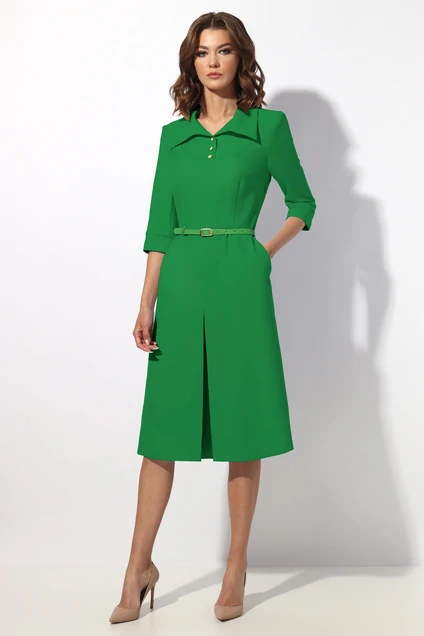 Платье женское отрезное по линии талии.На полочке подрез с застежкой на петли пуговицы.По горловине отложной воротник.Рукав втачной 3/4 с манжетой по низу .Юбка расширенная к низу со встречной складкой по центру.В боковых швах карман с отрезным бочком.В левом боковом шве застежка на потайную тесьму молния.Длина изделия 109 см.Длина рукава 40 см. Подойдет на рост 164-170 см.Цвет:ярко-зеленый.