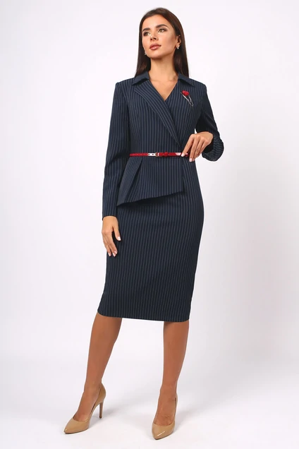 Элегантное платье полуприлегающего силуэта отрезное по линии талии выполнено из текстильной ткани.Верхняя часть платья повторяет форму жакета. Ассиметричные линии борта ,воротник и баска по линии талии придают платью определенный шик.Рукав втачной. В левом боковом шве имеется потайная молния.По низу спинки шлица.Брошь и ремень входят в комплект.Цвет платья: темно-синий в полоску.Длина изделия по спинке 106 см, рукав 61 см .Подойдет на рост 164-170 см.