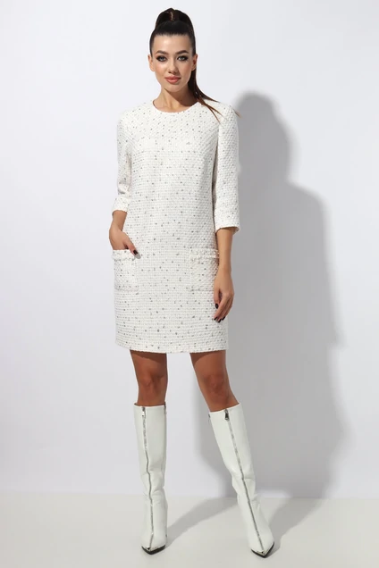 Платье женское прямого силуэта(на подкладке)с накладными карманами на полочке.На карманах отделка в виде бахромы с декоративными бусинами.По спинке застежка на отделочную тесьму молния.Рукав втачной 3/4. Длина рукава 44 см. Длина платья по спинке 90 см.Платье изготовлено из высококачественной твидовой ткани в стиле Шанель. Подкладка ПЭ 100%. Изделие подойдет на рост 164-170 см.