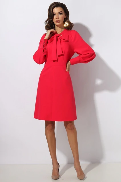 Платье женское отрезное по линии талии.Рукав полуреглан с подрезом по линии плеча.Низ рукава обработан манжетой с застёжкой на навесные петли и пуговицы.По горловине стойка, переходящая в бант.Низ юбки расширен.В левом боковом шве застёжка на потайную тесьму молния.Длина изделия 97 см.Длина рукава от подреза 65 см. Подойдет на рост 164-170 см. Цвет:коралловый.