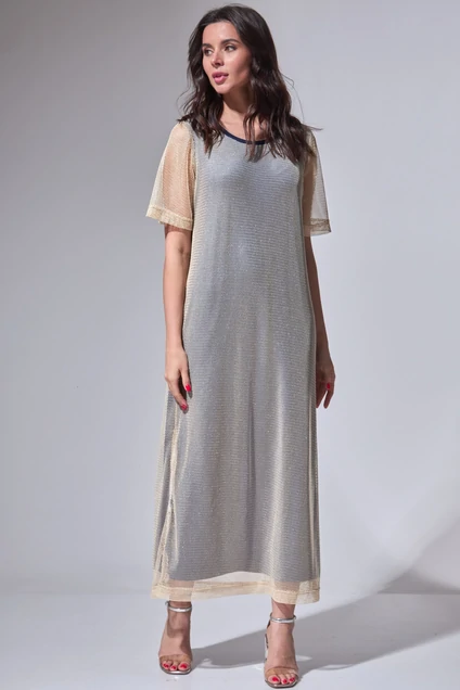 Универсальное платье, которое прекрасно вольется в Вашу повседневную жизнь. Двухслойное платье прямого свободного кроя выполнено из ткани сетка. Подкладка облегченная из тонкого мягкого вискозного трикотажа — идеально подойдёт для жаркого лета. Поверх подкладки ткань сетка с люрексом. Рукав короткий, горловина из контрастного довяза. Универсальность кроя сделают его любимым изделием Вашего гардероба в наступающем сезоне. Изделие может сочетаться как с кедами, босоножками, так и туфлями. Длина изделия по спинке от горловины 126 (+/-1) см, длина рукава 30 см. Изделие подойдет на рост 170 см.