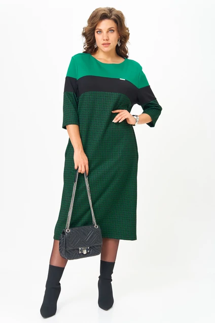 Продуманный крой скрывает лишнее и подчёркивает достоинства, а мягкий трикотаж обеспечивает комфорт на весь день. Преимущества модели: Комфортный плотный трикотаж — не просвечивает, не мнётся, держит форму. Светло-зеленая верхняя вставка подсвечивает лицо, создавая эффект сияния кожи. Контрастная деталь по груди визуально вытягивает силуэт и уравновешивает пропорции. Прямой силуэт подходит для любого типа фигуры Разрез сзади добавляет женственности и свободы движения. Универсальный стиль — для офиса, прогулок и повседневной элегантности. Платье, которое работает на ваш образ: делает моложе, стройнее и увереннее. Длина платья по спинке 114 см +\- 1 см, длина рукава 40 см +\-1 см. Изделие подойдет на рост 170 см.