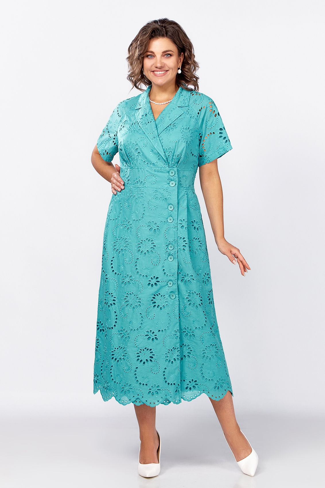 Элегантное женское платье полу-прилегающего силуэта, выполнено из ришелье, хлопка с вышивкой, на хлопковой подкладке. Лиф платья отрезной по линии талии, горловина V-образной формы, обработана воротником пиджачного типа. По линии талии втачной пояс из основной ткани, юбка платья расклешенного силуэта, со складками по линии талии, застежка по переду на петли-пуговицы в боковых швах карманы. Спинка также отрезная по линии талии, с поясом присборенным на резинку, верх спинки с имитацией запаха и небольшим вырезом под воротником, что придает пикантности и романтичности изделию. Рукав покроя реглан, из ришелье на просвет. Стильное платье в трендовых расцветках это прекрасный выбор для летнего образа! Длина 127 см. в 52р. Ширина груди- 54см, Ширина талии -47см, Ширина бедер- 66см, длина рукава- 34см, ширина рукава 20,5см