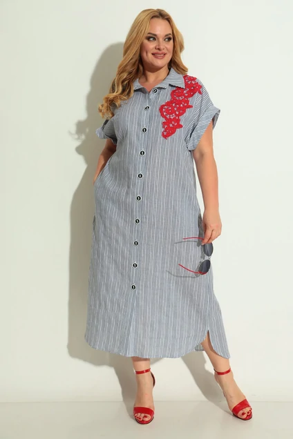 Платье рубашечного типа, свободного облегания - выполнено из натуральной ткани. Универсальность кроя сделают его любимым изделием Вашего гардероба в наступающем сезоне. По переду застегивается на пуговицы, снизу разрез. Рукав цельнокроеный приспущенный на отложенной манжете. Благодаря встречной вкладке на спинке имеет небольшое клешение. В качестве декора спереди платья— апликация из яркого кружева. Длина изделия по спинке от горловины 134 (+/-1) см. Изделие подойдет на рост 170см.