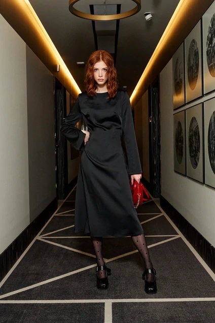 Платье приталенного кроя, из самого трендового материала будущего сезона - с легким блеском. Струящаяся, пластичная ткань. Разрезы на рукавах, красивый V-образный вырез на спине
