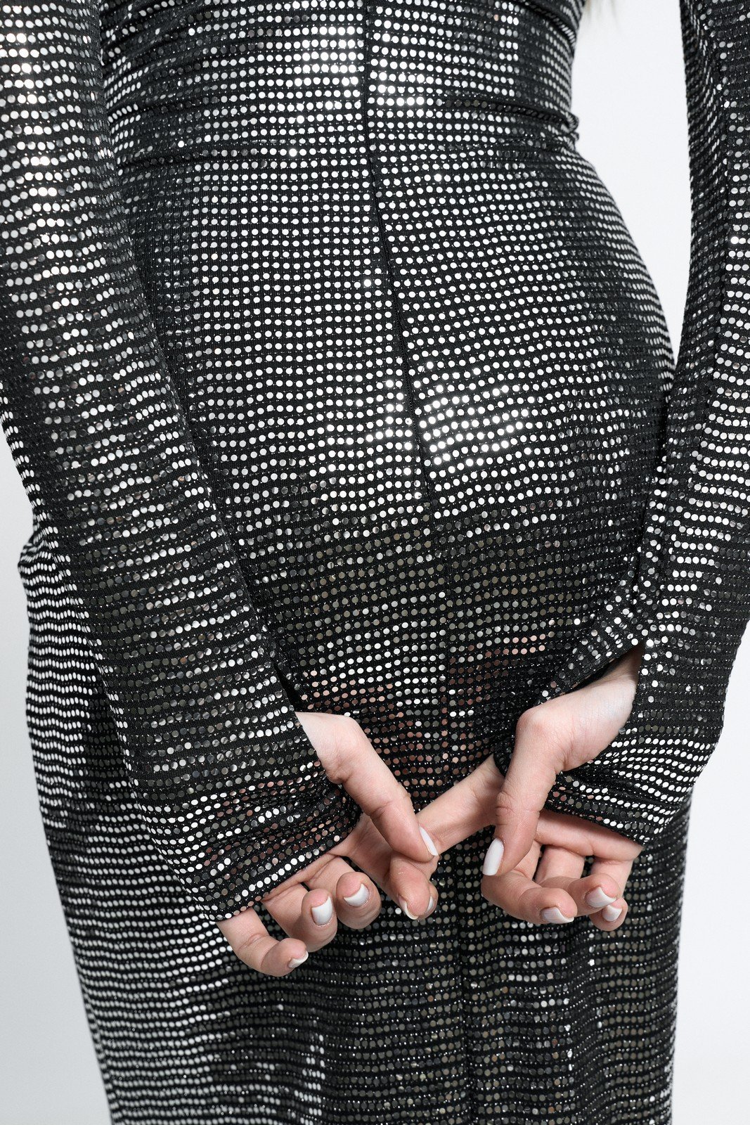 Элегантное длинное платье серебристого цвета выполнено из блестящего трикотажа, создающего непревзойденное сияние. Модель облегающего кроя подчеркивает фигуру, а углубленный вырез добавляет изысканности. Дизайн платья включает подплечники, придающие четкость силуэту, а сборка в области живота эффектно моделирует область талии. Застежка-молния, расположенная сзади, обеспечивает удобство при надевании. Это платье - идеальный выбор для торжественного мероприятия или вечернего выхода.