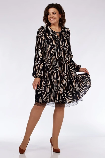 Платье женское свободного силуэта. Округлый вырез горловины, на завязках. Рукав втачной, со сборкой, по низу-на резинке. Изделие с подрезами, со сборкой. По спинке-декоративный вырез с кружевом. Нижний валан платье выполнен из сетки с кружевом.