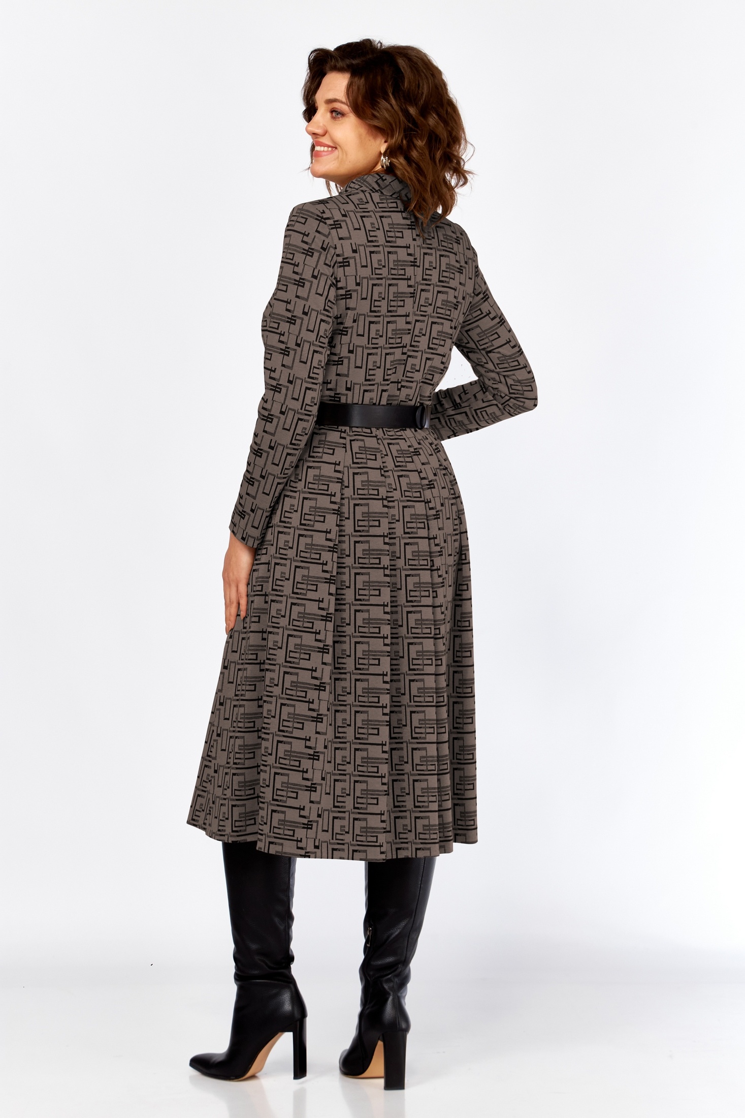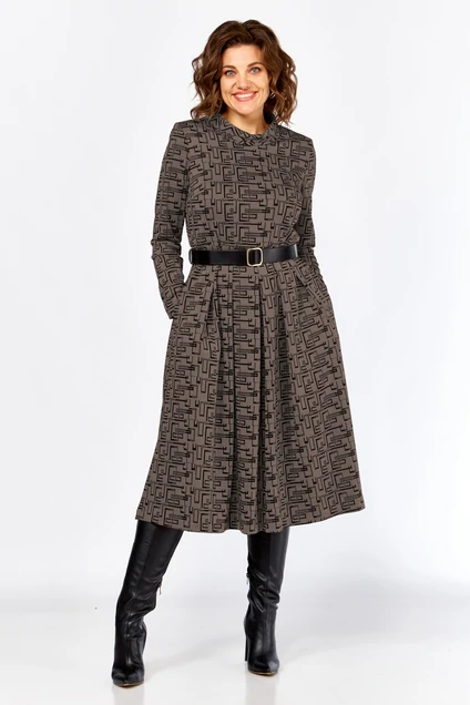 Элегантное женское платье полуприлегающего силуэта, выполненное из ткани с графическим принтом в тонкий геометрический узор. Платье украшено округлой горловиной и стойкой воротником «хомут». Втачной длинный рукав добавляет изысканности. Подчеркните талию с помощью включенного в комплект тонкого пояса с элегантной пряжкой. Длина платья составляет 121 см, а длина рукава – 62 см. Подрез по талии со складками обеспечивает идеальную посадку и комфорт, делая этот наряд идеальным выбором для офиса или особых случаев.