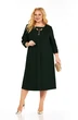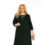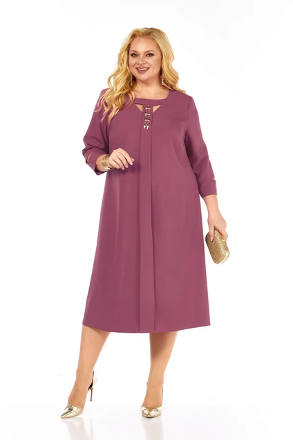 Нарядное платье длины миди, А-образного силуэта, без подкладки. Вырез горловины V-образный c дополнительными декоративными деталями – планками, украшен нашивной золотой деталью. На полочке спереди застрочена вертикальная складка, которая создает эффект удлинения силуэта. Рукава длиной ¾, с декоративными вырезами на внешней стороне руки. С карманами-хулиганами в боковых швах. Спинка со швом. Длина платья – 110 см, длина плечевого шва – 10 см, длина рукава – 48 см.