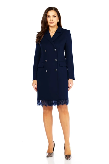 Двубортный жакет-платье, полуприлегающего силуэта, из костюмной ткани, без подкладки. Воротник-с отложными лацканами пиджачного типа, рукава – двухшовные. По переду – вытачки, прорезные карманы с клапанами и двумя листочками. Жакет имеет 6 пуговиц и одну потайную. По низу изделия и в шве рукава используется кружево, для придания романтизма классическому образу. Длина плечевого шва - 12 см, длина рукава - 61 см, длина изделия по спинке - 91 см и 97 см с кружевом.