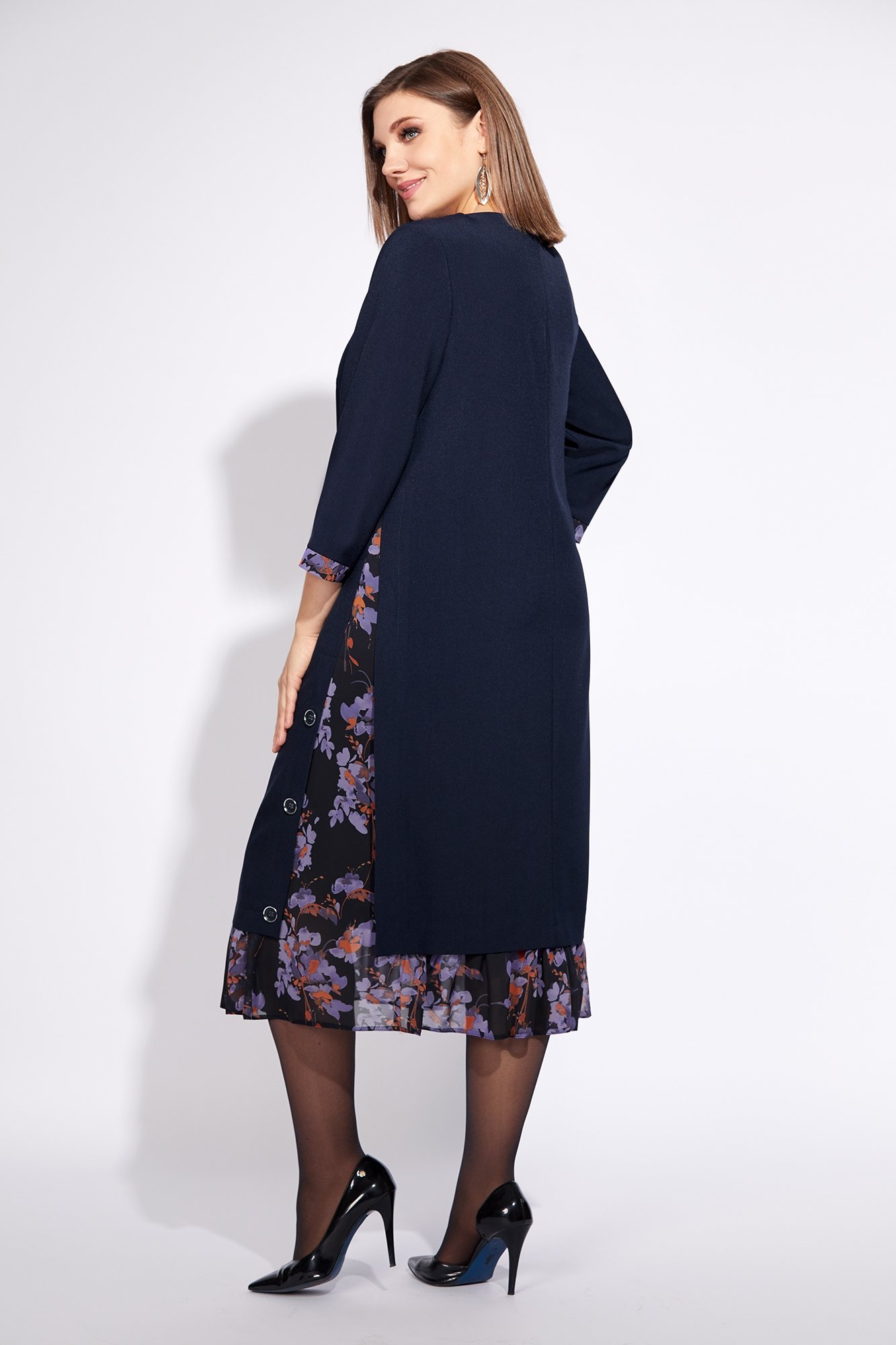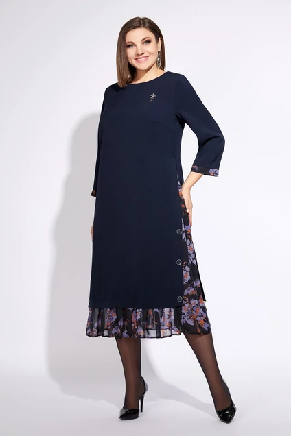 Платье женское прямого силуэта. Рукав втачной. По боковой и нижней части переда и спинки-вставки из отделочной ткани. В среднем шве спинки застёжка на тесьму-молнию. По нижней части переда отделочные пуговицы. Длина по спинке-115см, длина рукава-51см.