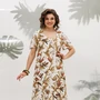 Нарядное платье свободного силуэта выполнено из плиссированной ткани, поставлено на трикотажную подкладку. На полочке обработана отрезная кокетка, остальные воланы отлетные, края заработаны флешем. Рукав втачной, до локтя, слегка расклешен. Спинка идентична полочке, горловина окантована. Платье декорирована цветком. В этом платье прекрасно скрываются все недостатки фигуры, а благодаря легкости ткани ваш образ будет воздушным и нежным! Длина 98. Длина рукава (в52р.) - 30, Ширина рукава-42, Ширина груди-53, Ширина бедер-58