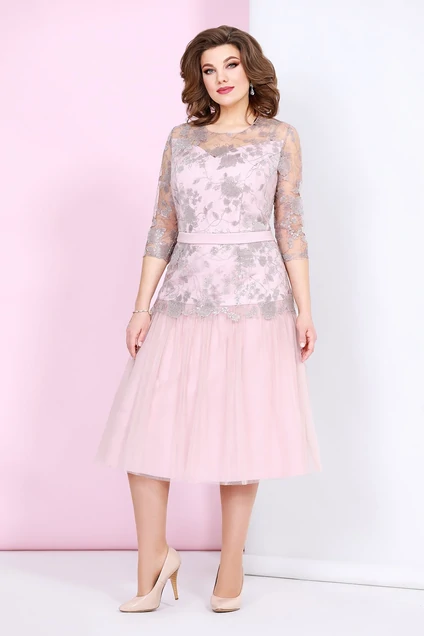 Нарядное платье полуприлегающего силуэта с расширенной к низу юбкой выполнено из нежного кружева с пайетками, однотонной плательной ткани (ткань немного тянется) и мягкого фатина. Платье отрезное по линии талии с втачным поясом. По лифу переда платье с фигурными рельефами. По спинке талиевые вытачки и потайная застежка-молния в среднем шве. Рукав платья втачной, длиной ¾ выполнен из кружева на просвет. Юбка платья с подрезом к которому притачен присборенный двойной волан из фатина. Длина 114 см.в 52р. Ширина груди- 53см, Ширина талии -47см, Ширина бедер 60см, Длина рукава 45см, Ширина рукава-19см