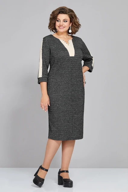 Трикотажное платье полу-прилегающего силуэта, выполнено из трикотажного полотна, в качестве отделки трикотаж контрастного цвета. Горловина платья округлой формы с вставками из светлого трикотажа, декорированы хольнитенами. Рукав втачной, оптимальной длины, с вставкой из светлого трикотажа и также декорирована хольнитенами. Спинка выполнена из трикотажа, со средним швом и вытачками. Платье очень удобное и теплое, а маленькие элементы декора придают ему эффектности. Длина 109 см. в 58р. Ширина груди- 58см, Ширина талии -56см, Ширина бедер- 62см, длина рукава- 45см, ширина рукава 20,5см