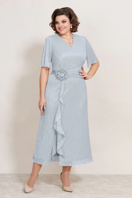Нарядное женское платье полу-прилегающего силуэта, выполнено из плиссированной ткани, на трикотажной подкладке. Горловина V-образной формы, на обтачке, лиф платья отрезной по линии талии, с втачным поясом из основной ткани, декорирован съемным цветком. Юбка А-образного силуэта, на юбке выполнен вертикальный подрез, с разрезом по низу и вставками воланов из основной ткани. Спинка со средним швом и вытачками, рукав втачной, оптимальной длины, выполнен из основной ткани. Эффектное платье из нежной и эффектной ткани прекрасно подойдет для любого мероприятия. Длина 134 см. в 52р. Ширина груди- 53см, Ширина талии -47см, Ширина бедер- 58см, длина рукава- 28см., ширина рукава 21см