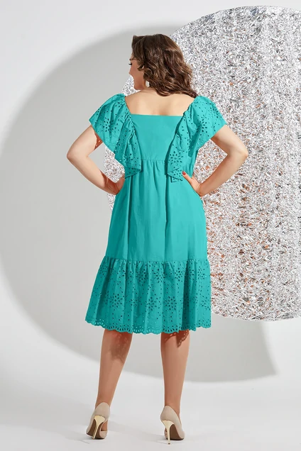Летнее платье свободного покроя, выполнено из хлопковой ткани и хлопка с вышивкой. Горловина платья округлой формы, обработана притачным воланом, присборенным по горловине, из хлопковой ткани с вышивкой. Также на полочке обработана кокетка из однотонного хлопка, нижний волан присборен и выполнен из хлопка с вышивкой. Спинка выполнена из однотонного хлопка, со средним швом и вытачками, в среднем шве потайная молния. Легкое, эффектное платье на хлопковой подкладке отличный вариант для вашего летнего гардероба! Длина 105 см от плеча. в 52р. Ширина груди- 53см, Ширина талии -74см, Ширина бедер- 74см.