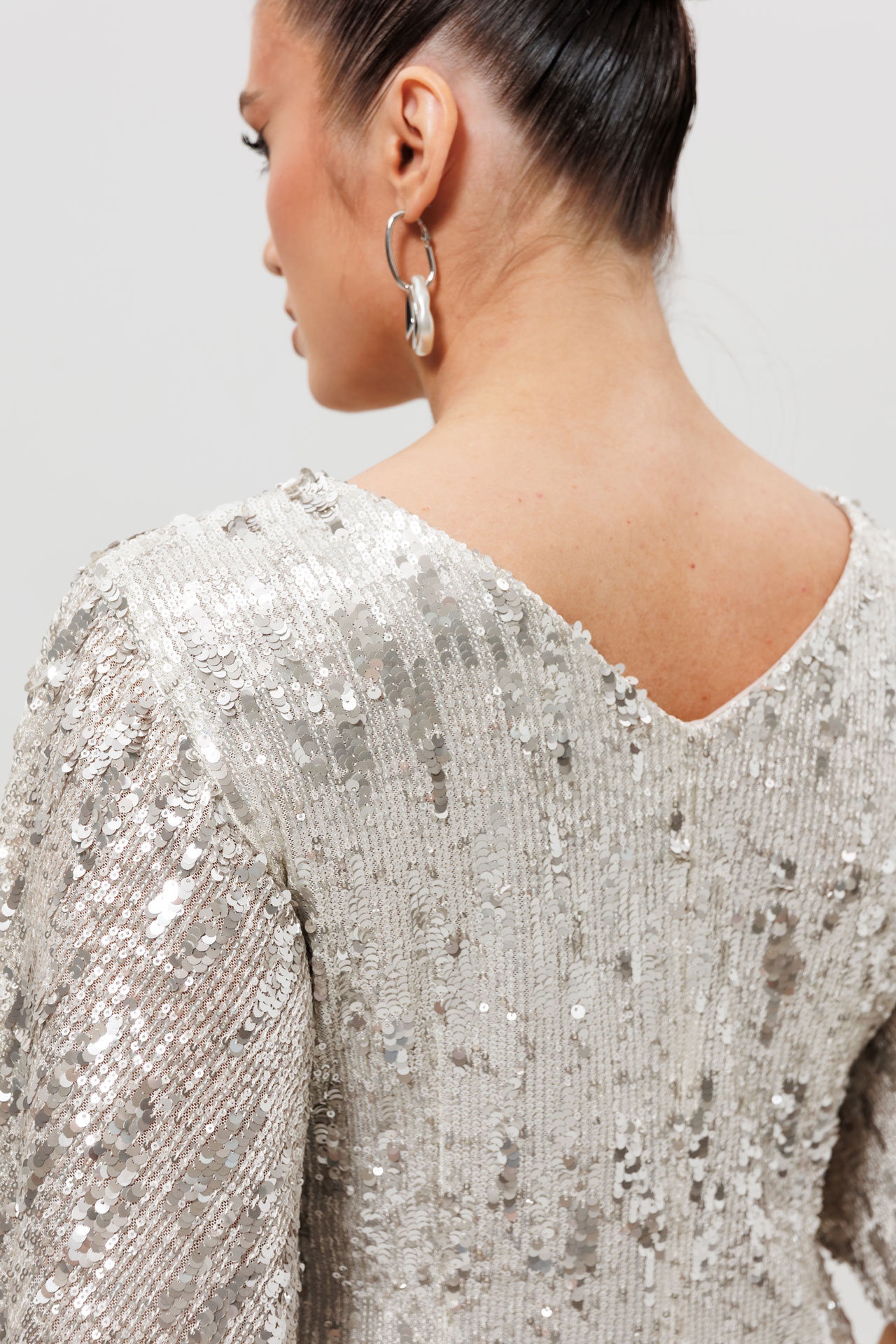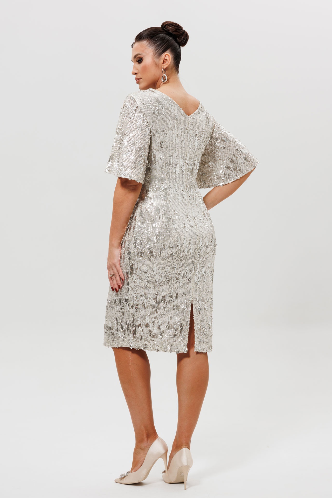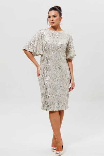 Платье из серебристых фактурных пайеток с рукавами-крылышко. Это платье из серебристых пайеток создано для особых моментов. Прилегающий силуэт подчеркивает все достоинства фигуры. Модель отличается элегантной деталью — V-образным вырезом на спинке, который завершается изящным разрезом. Рукава-крылышко добавляют образу легкости и женственности. Платье на подкладке, а фактурные пайетки не колются и приятны к телу, обеспечивая комфорт на протяжении всего вечера. Это праздничное платье станет блестящим выбором для новогоднего банкета, свадьбы или выхода в свет. Посмотрите другие наши платья арт. 1045, 1161, 1037 - в черных и золотых пайетках.