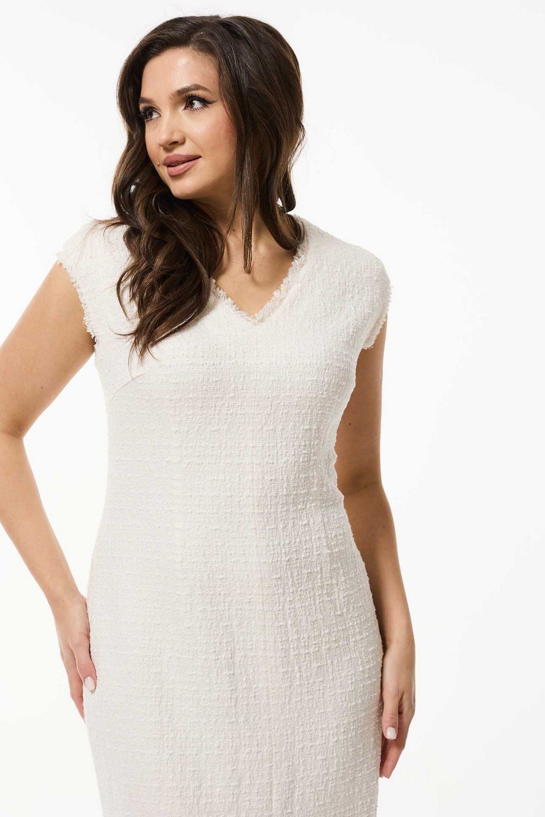 Платье женское прилегающего силуэта. Головина v-образная. Перед платья со средним швом, заканчиающимся разрезом. Спинка со средним швом, в который вшита потайная молния. Горловина и пройма изделия обработаны декоративной тесьмой. Платье без подкладки.