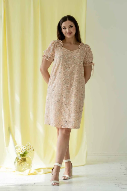 Платье женское А- силуэта выполнено из ткани шитьё ришелье на шифоне. Перёд с нагрудными вытачками. Кокетка переда и спинки присборена с рюшей. Горловина фигурная. Рукава одно шовные втачные, «фонарики» , по низу кулиса. Ширина низа рукава регулируется. Платье на хлопковой тонкой подкладке.