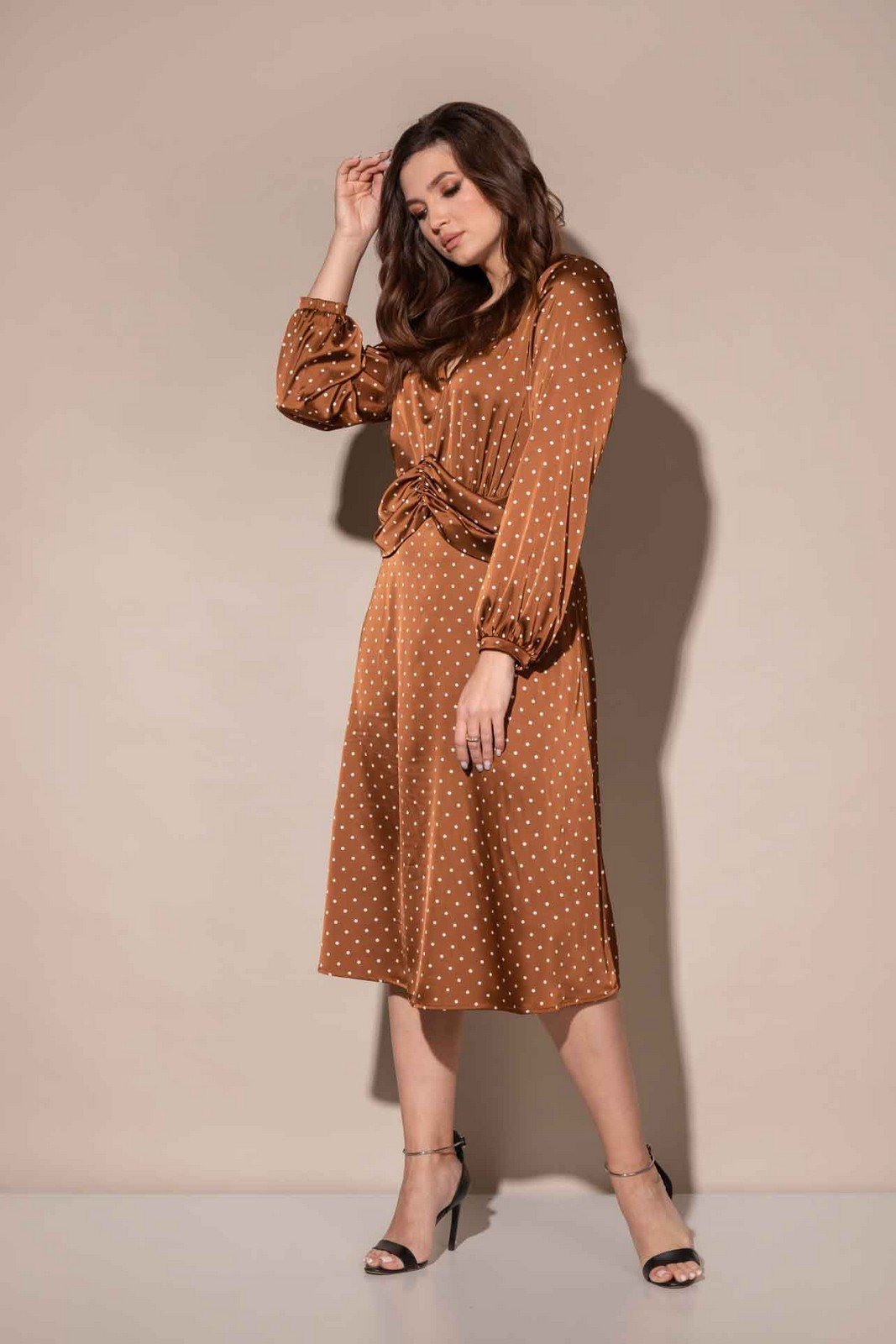 Платье женское полуприлегающего силуэта отрезное по линии талии, слегка расширенное к низу, выполнено из тонкой плательной ткани. По переду линии талии сборка. Горловина V-образная. В центральном шве спинки застёжка потайная тесьма молния. Рукава одно шовные свободные втачные на тонкой манжете. Украшает платье притачной декоративный элемент со сборками.