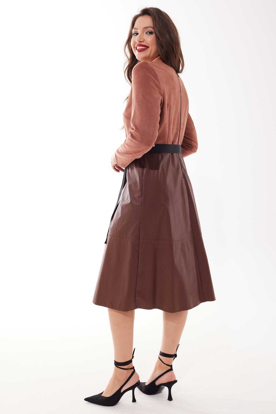 Платье женское отрезное по линии талии, слегка расклешённое, комбинированное из двух различных по фактуре тканей. Лиф платья и рукава выполнены из ткани микровельвет, юбка из ткани эко кожа. По переду нагрудные вытачки и фигурный накладной карман. По спинке талевые вытачки и застёжка молния в центральном шве спинки. Юбка четырёхклинка . Горловина круглая. Рукава двух шовные втачные. Платье без подкладки. Дополнением служит пояс. Украшают платье отделочные строчки. Состав ткани: Вискоза-50%+полиуретан 50%