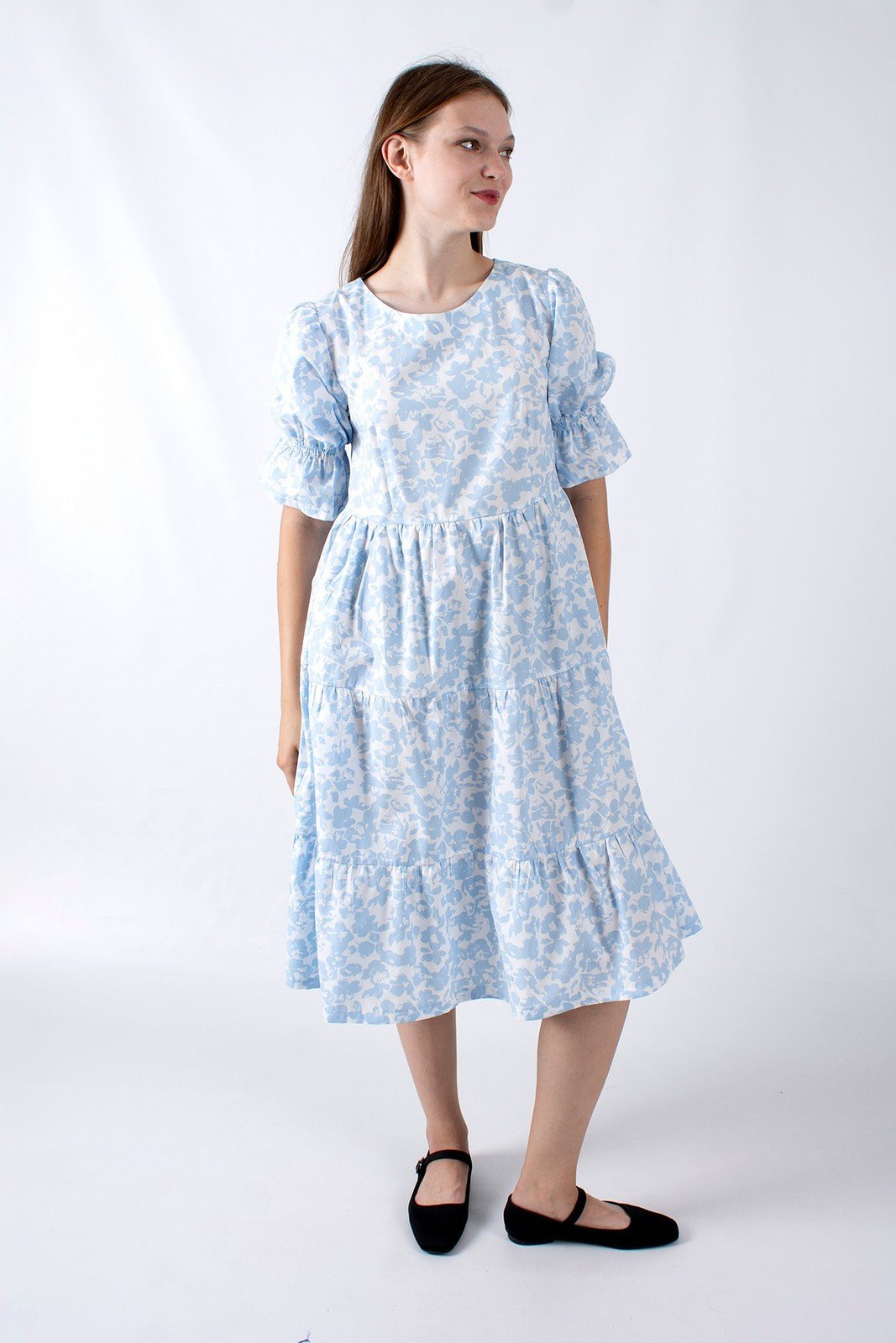 Платье. Завышенная линия талии. А-образного силуэта. Три волана. Рукав фонарик с бантом. Длина изделия: 110 см