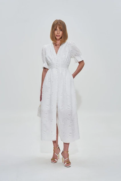 Платье выполнено из премиальной фактурной вискозной ткани с дизайнерским переплетением нитей. Платье с застежкой на пуговицы, отрезное по линии талии. Платье прекрасно подчеркнет ваши достоинства! И вы можете быть уверены, что больше никто не придет на праздни к в таком же платье!
