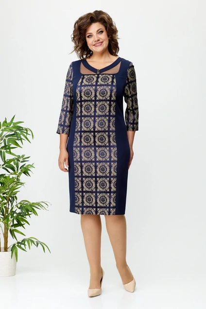 Платье женское полуприлегающего силуэта, без подкладки, молния в среднем шве спинки. Перед с рельефами от горловины, вставка фигурной формы из сетки. Спинка со средним швом, талиевые выточки, шлица, молния в среднем шве спинки. Рукав втачной за локоть.