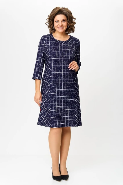 Платье женское, прямого силуэта, без подкладки, тесьма-молния в левом боковом шве. Горловина переда обработана бейкой. Перед и спинка с рельефами от проймы до низа, по низу боковой части платья волан с застроченными складками. Рукав двухшовный, втачной, с шлицей, закрепленной пуговицами, по окату рукава заложены складки. На складку бокового шва пришиты две пуговицы. В качестве отделки пристегнута брошь слева на бейку переда.