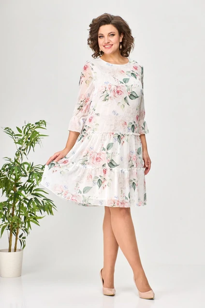 Ткань: шифон. Платье женское прямого силуэта, на подкладке, застежка по горловине спинки на навесную петлю и пуговицу. Перед и спинка отрезные ниже талии. На верхней части переда располагаются нагрудные вытачки. Горловина обработана обтачками. Верхняя часть спинки разрезная, талиевые вытачки. По низу настрочены два ряда присобраных воланов, нижний волан настрочен на низ верхнего волана. Рукав одношовный, втачной, свободный, внизу присобран на эластичную тесьму, образуя манжету ввиде волана.