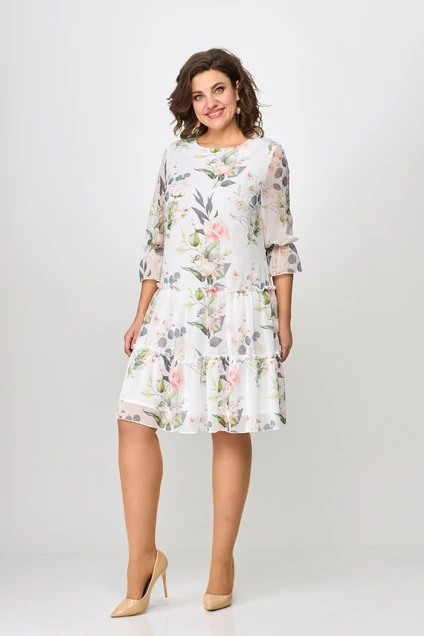 Ткань: шифон. Платье женское прямого силуэта, на подкладке, застежка по горловине спинки на навесную петлю и пуговицу. Перед и спинка отрезные ниже талии. На верхней части переда располагаются нагрудные вытачки. Горловина обработана обтачками. Верхняя часть спинки разрезная, талиевые вытачки. По низу настрочены два ряда присобраных воланов, нижний волан настрочен на низ верхнего волана. Рукав одношовный, втачной, свободный, внизу присобран на эластичную тесьму, образуя манжету ввиде волана.