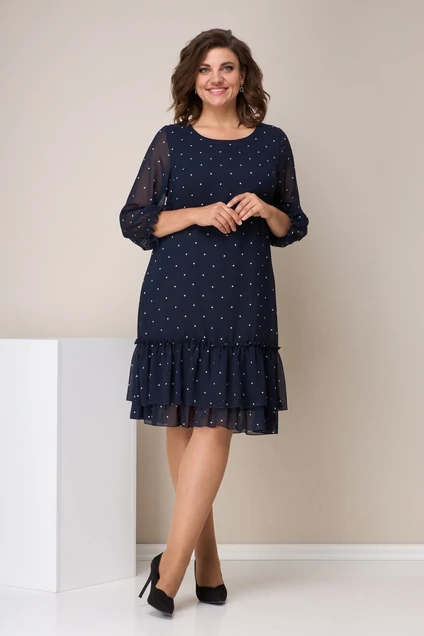 Платье женское прямого силуэта, на подкладке, застежка по горловине спинки на навесную петлю и пуговицу. Перед с нагрудными вытачками. Спинка без вытачек, не разрезная. По низу настрочен присобраный волан. К подкладке по низу пришит волан, волан длиннее платья. Рукав одношовный, втачной, свободный, по внизу присобран на эластичную тесьму в несколько рядов.