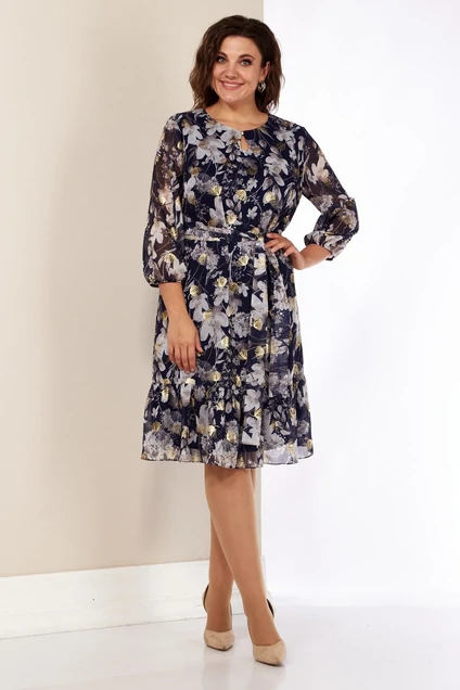 Платье женское свободного силуэта, на подкладке, без застежки. Перед с нагрудными вытачками, по горловине вырез «капелька». Спинка со средним швом, без вытачек. Горловина обработаны обтачкой. По низу платья пришит присобраный волан. Рукав одношовный, втачной, свободный, низ присобран на эластичную тесьму. Пришито украшение над вырезом «капелька» переда. В дополнении пояс из основной ткани, завязывается на талии.