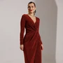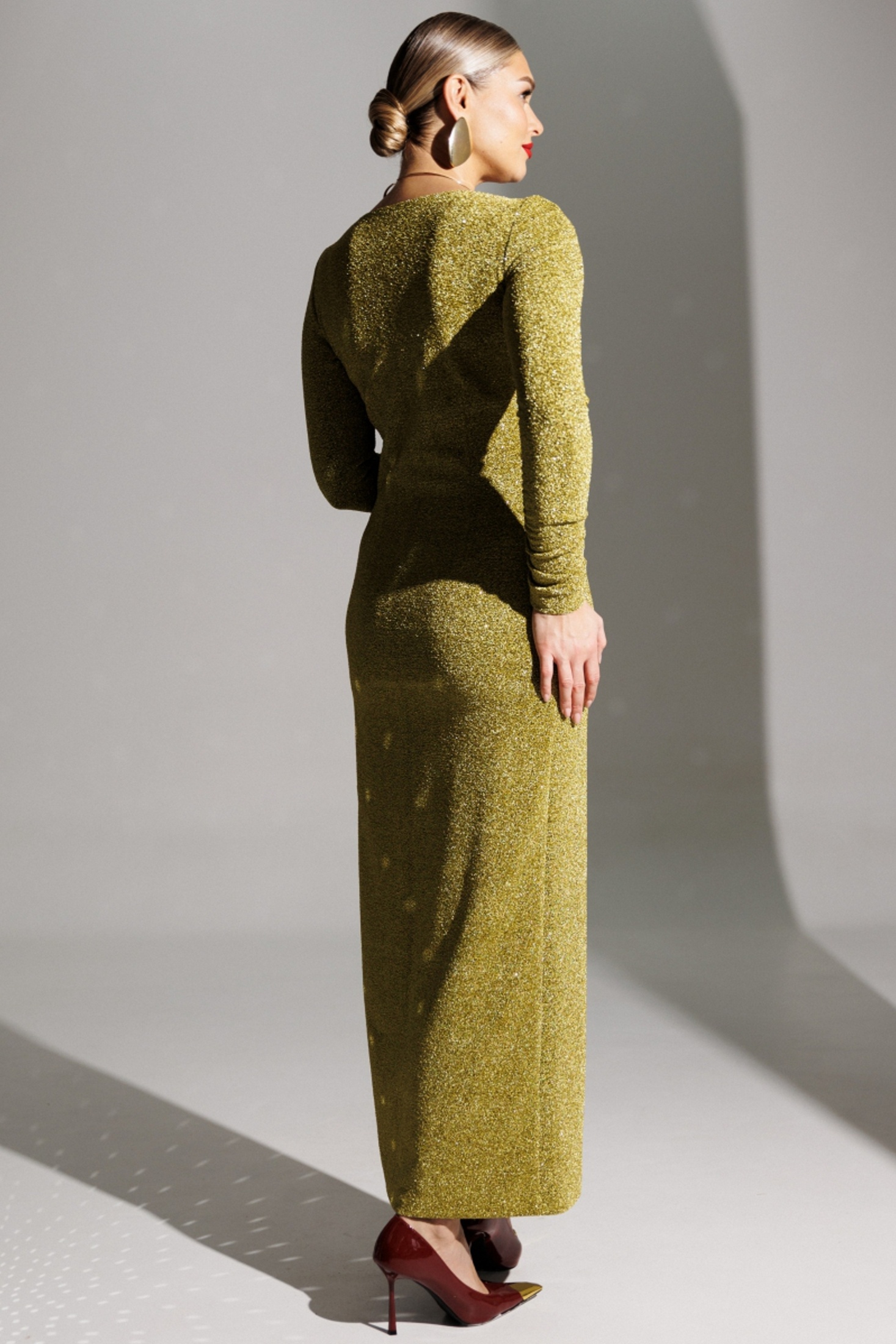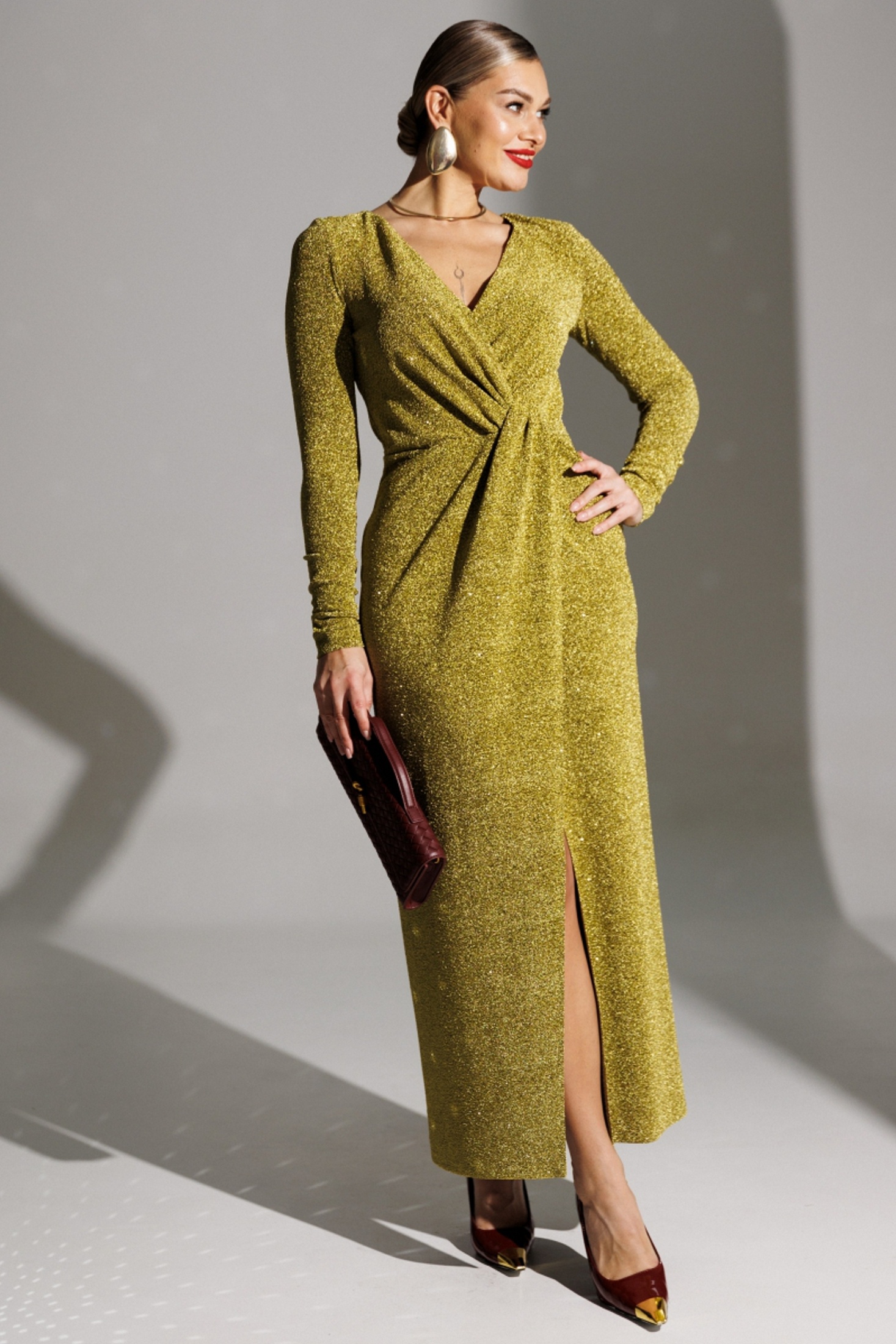 Блеск софитов, огни салютов, игривые пузырьки в бокале - и Ваше сияние обеспечено нашим вечерним платьем! Это действительно озорно, игриво, празднично! И, как ни крути, приковывает взгляды! Представленное платье приталенного силуэта. Спинка с талиевыми вытачками. Перед отрезной по линии талии. Лиф с эффектным V-образным вырезом и узлом в области талии. Юбка на запах. Рукав полуреглан, присборенный на резинку в нижней части (по шву). Платье на подкладке. Материал платья - тонкий трикотаж с блеском. Хорошо тянется. длина рукава (полуреглан): 68 см длина спинки: 143 см