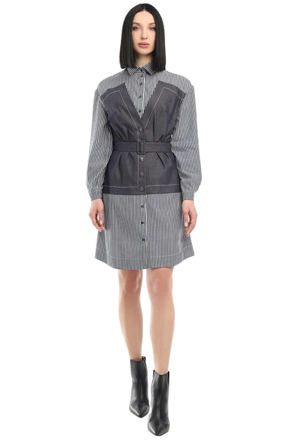 Платье-рубашка - must have сезона 2021. Модель выполнена из джинса в сочетании с полоской. Перед и спинка платья с кокеткой. Рукав рубашечный, снизу с манжетой, которая застегивается на петли-пуговицы. Низ платья обработан подкройной обтачкой и отстрочен широкой отделочной строчкой. Спинка с рельефами. Воротник рубашечный. Дополнением к платью является съемный пояс, который позволяет регулировать ширину по линии талии. длина спинки: 95 см