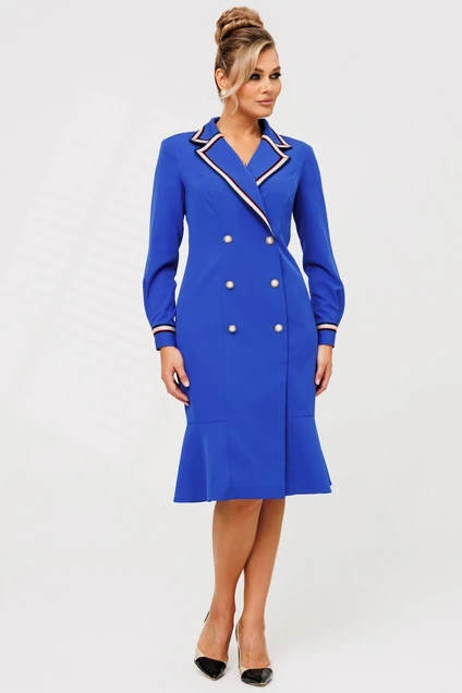Декором и ярким акцентом является тесьма, которая настрочена на воротник и лацканы. Платье на подкладке.