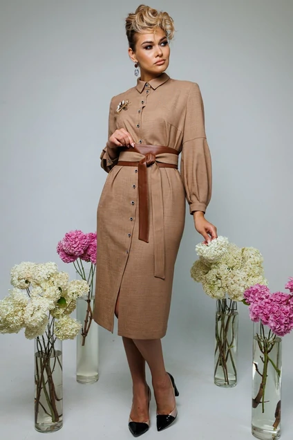 Платье прямого силуэта, спереди с нагрудной вытачкой, выходящей из бокового шва. Рукав одношовный, расширенный к низу, снизу на притачной манжете.
