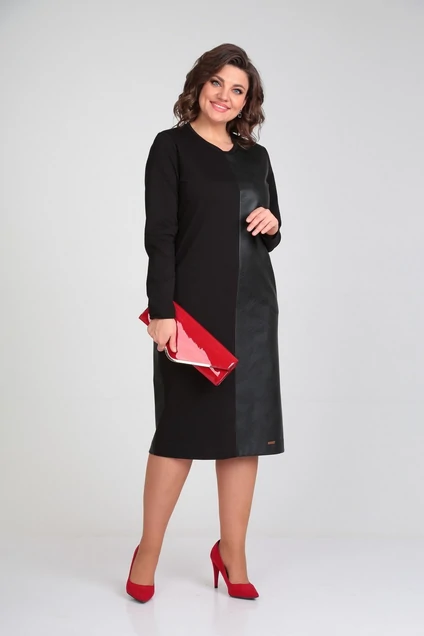 Элегантное женское платье прямого силуэта, выполнено из двух видов ткани: из комфортного трикотажного полотна (тянется) и эко кожи (чуть тянется). Перед и спинка с центральными швами. Горловина округлой формы, оформлена отрезной планкой. Рукав втачной одношовный. По низу левой части и переда пришита декоративная нашивка. В боковых швах карманы. В комплект входит пояс из основной ткани. Длина платья – 110 см. Ширина спинки – 41 см. Длина рукава – 62 см.
