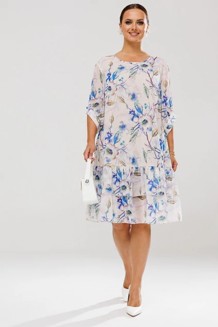 Платье женское прямого силуэта, выполненное из шифона (не тянется), на эластичной подкладке. Подкладка соединена с платьем. Перед и спинка платья цельные. По низу платья – два ряда присборенных воланов. Горловина округлой формы, обработана окантовкой, по спинке обработана застежка-капелька на навесную петлю-пуговицу. Рукав втачной, длиной ¾ с фигурным присборенным низом и с притачной манжетой. Манжета рукава декорирована отделочной пуговкой.