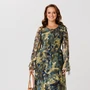 Нарядное платье, выполненное из крепа на трикотажной основе с тоненькой нитью люреска (тянется). Платье А-силуэта. Спинка со средним швом. Горловина округлой формы, обработана окантовкой. Рукава втачные, одношовные, расширенные к низу. Платье декорировано съемным цветком на булавке (цветок может отличаться от фото). Платье без подкладки.